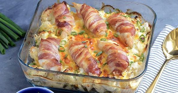 - Sæt fadet tilbage i ovnen, og bag retten yderligere 20-25 minutter, til kyllingen er mør. Skru evt. over på grill de sidste 4-5 minutter, så baconen får en god gylden farve.