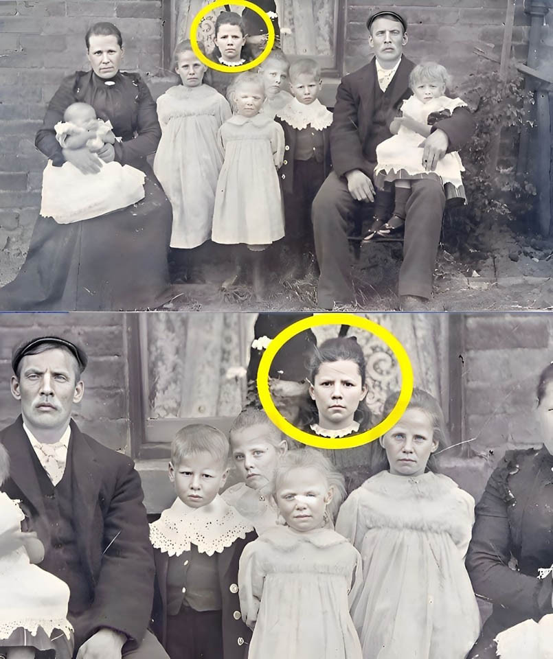 Forestil dig at finde et gammelt familiefoto, der er ødelagt af tiden og gulnet af årene. Et tilsyneladende almindeligt billede: en far, en mor med en baby og fire velopdragne børn foran en murstensvæg. Ikke noget særligt... Indtil en detalje dukker op efter en digital restaurering.