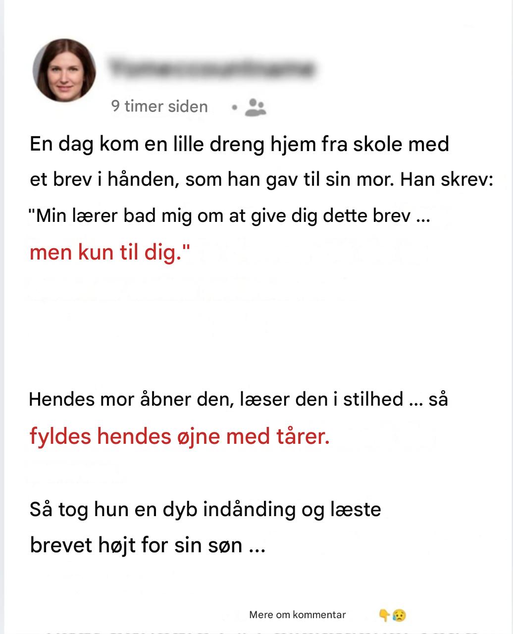 Hans mor åbner den, læser den i stilhed… og så fyldes hans øjne med tårer.