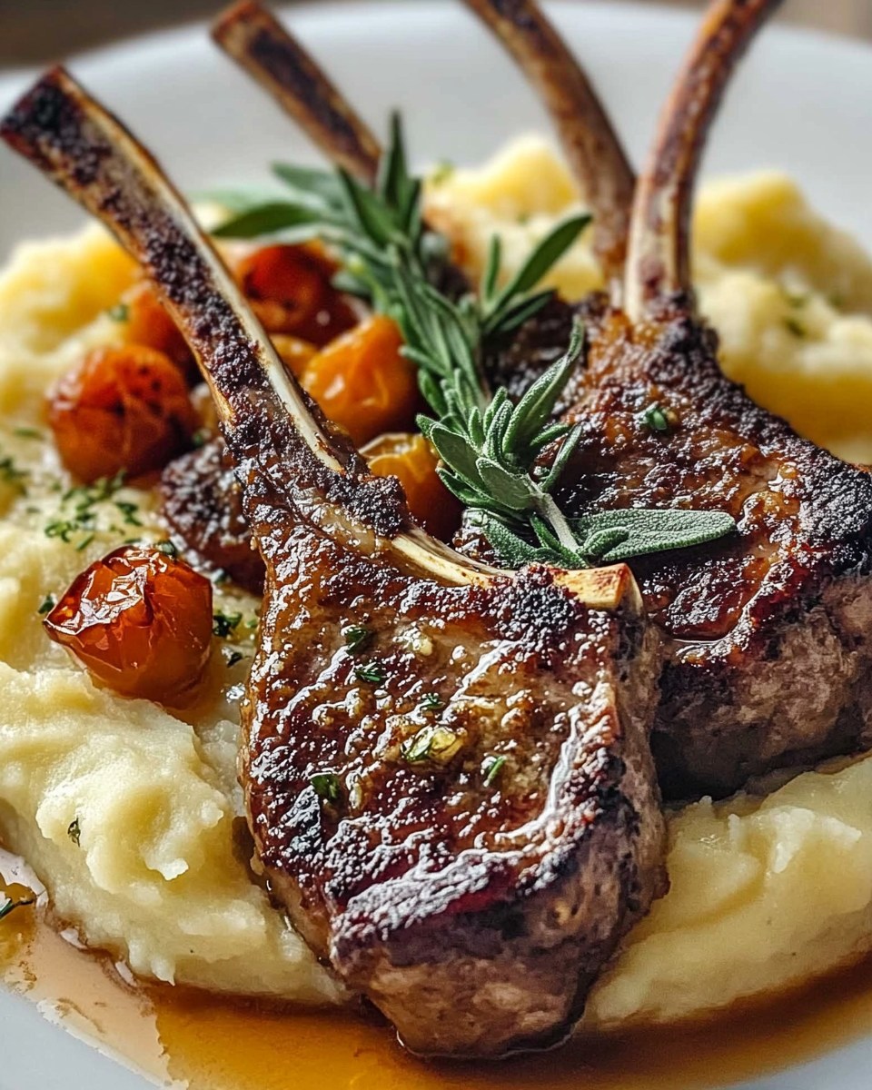 Pandestegte lammekoteletter med hvidløg og rosmarin, mos af brunet smør og australsk café-garnityr